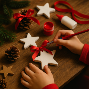 Mit Gips, Holz, Naturmaterialien, Schleifenbändern, Tannenzapfen und vielem mehr entstehen kleine Kunstwerke, die auf dem Weihnachtsmarkt zugunsten unserer Jugendkasse verkaufen werden. Natürlich darf auch jedes Kind ein Andenken mit nach Hause nehmen.
